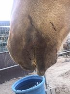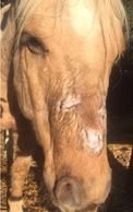 While peacefully dining in his corral, our dear old palomino, "Murph" was bit in the face by a large rattlesnake. Although we called the veterinary medicine hospital that 1st night- we had no idea that a snake bite was what we were dealing with until dawn of the next day. Murph ultimately did receive the Horse Rattlesnake anti venom...but
